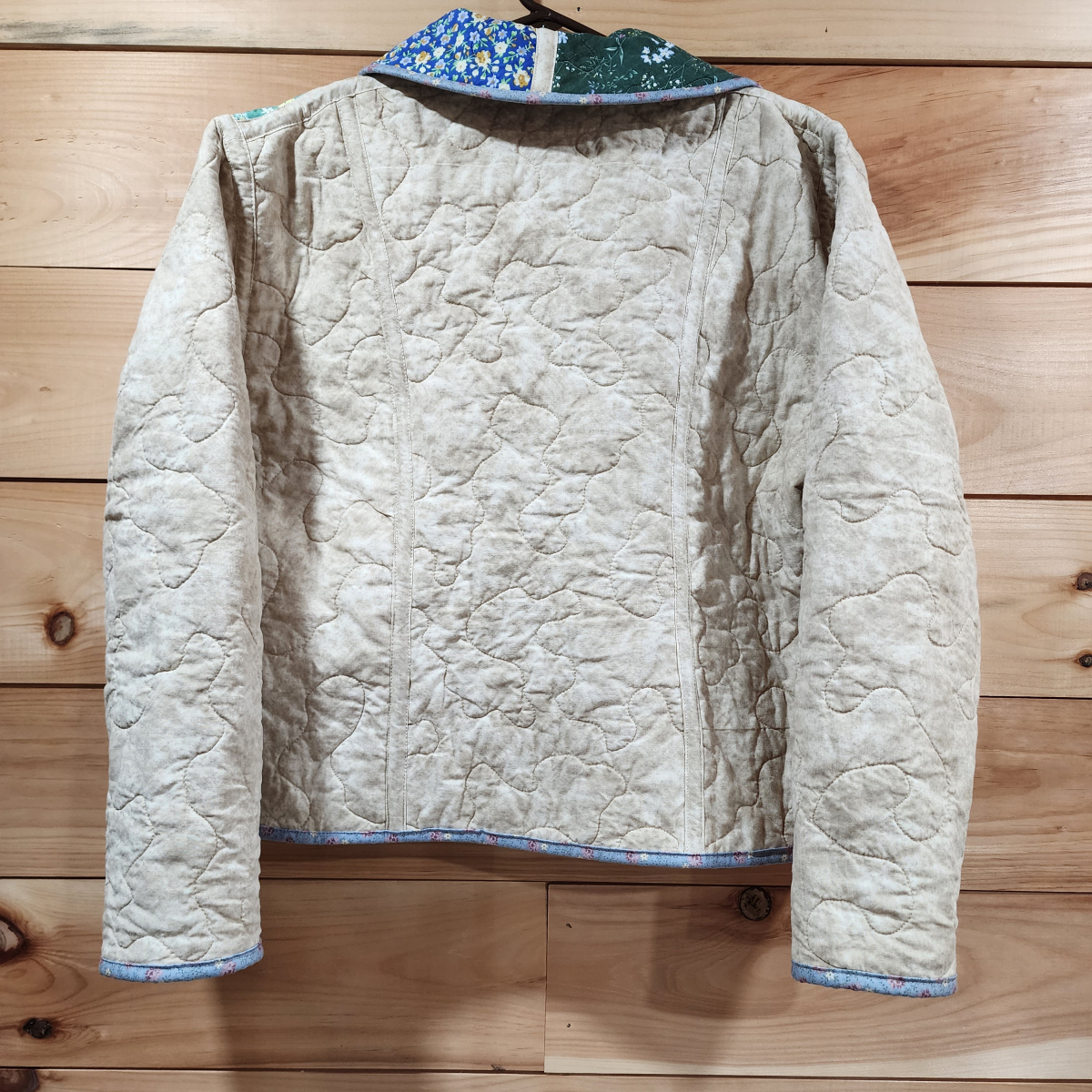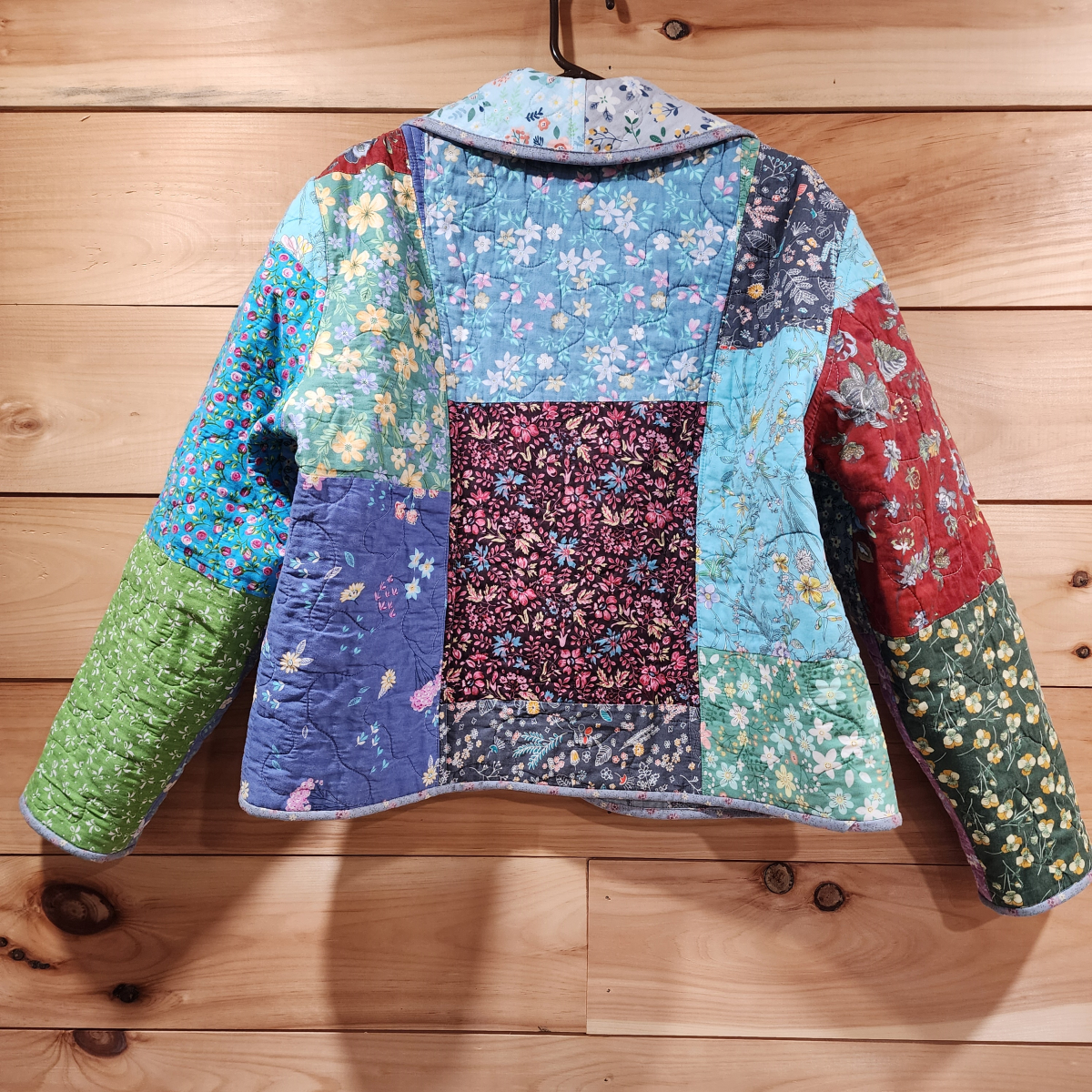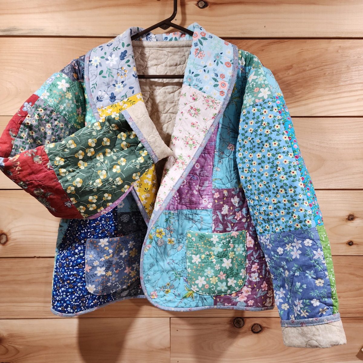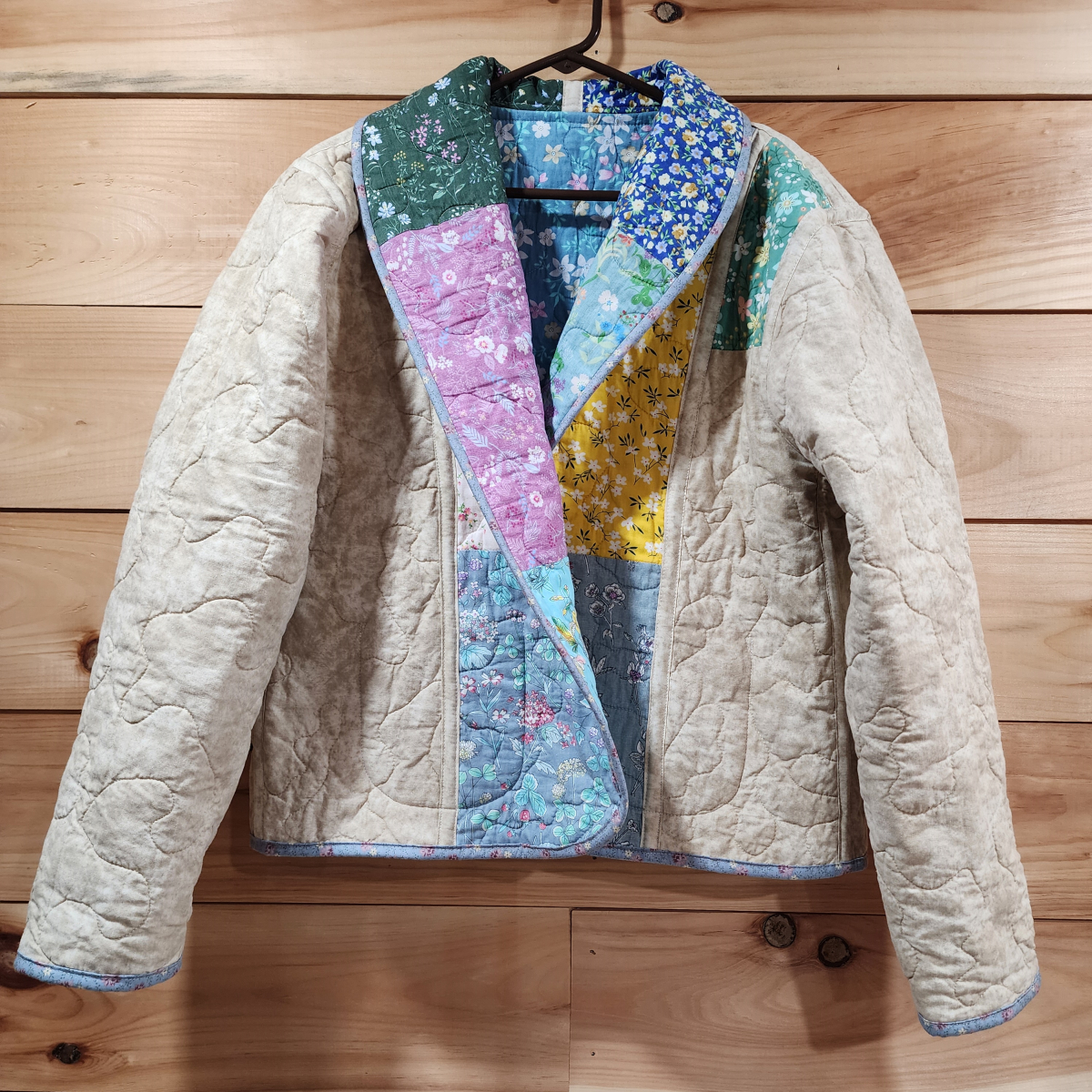 This jacket was handmade from brand new cotton fabric. The fabric was pieced, batted, and quilted. Then it was washed and dried to soften and pre-shrink the quilted material before the jacket was cut out and hand made.