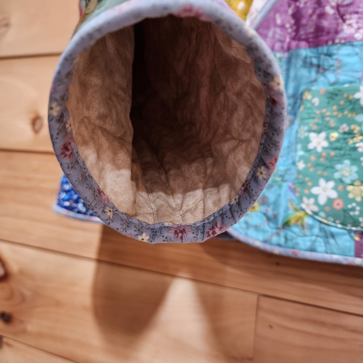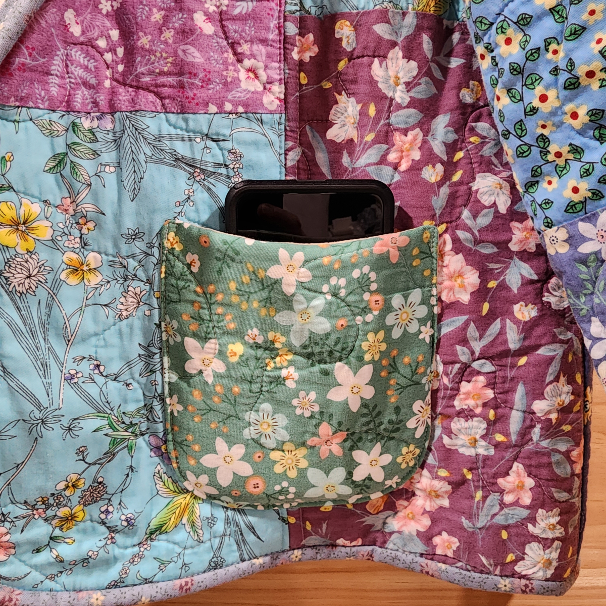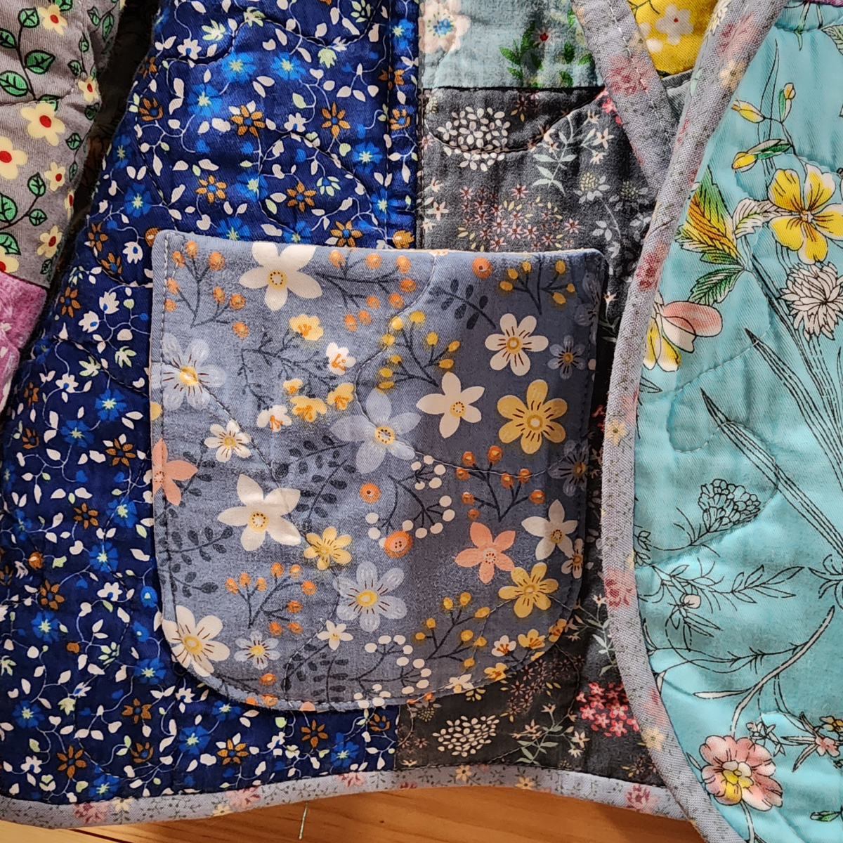 This “made from new materials’ quilted jacket is called The Freya Jacket. It is a short, fully lined princess style jacket with a shawl collar and open front. It has bound finished edges at the sleeve ends, bottom of jacket and up the front around the collar. It has two lined patched pockets for fashion and function. The pockets are large enough to hold a cell phone or small wallet. All seams inside are finished.